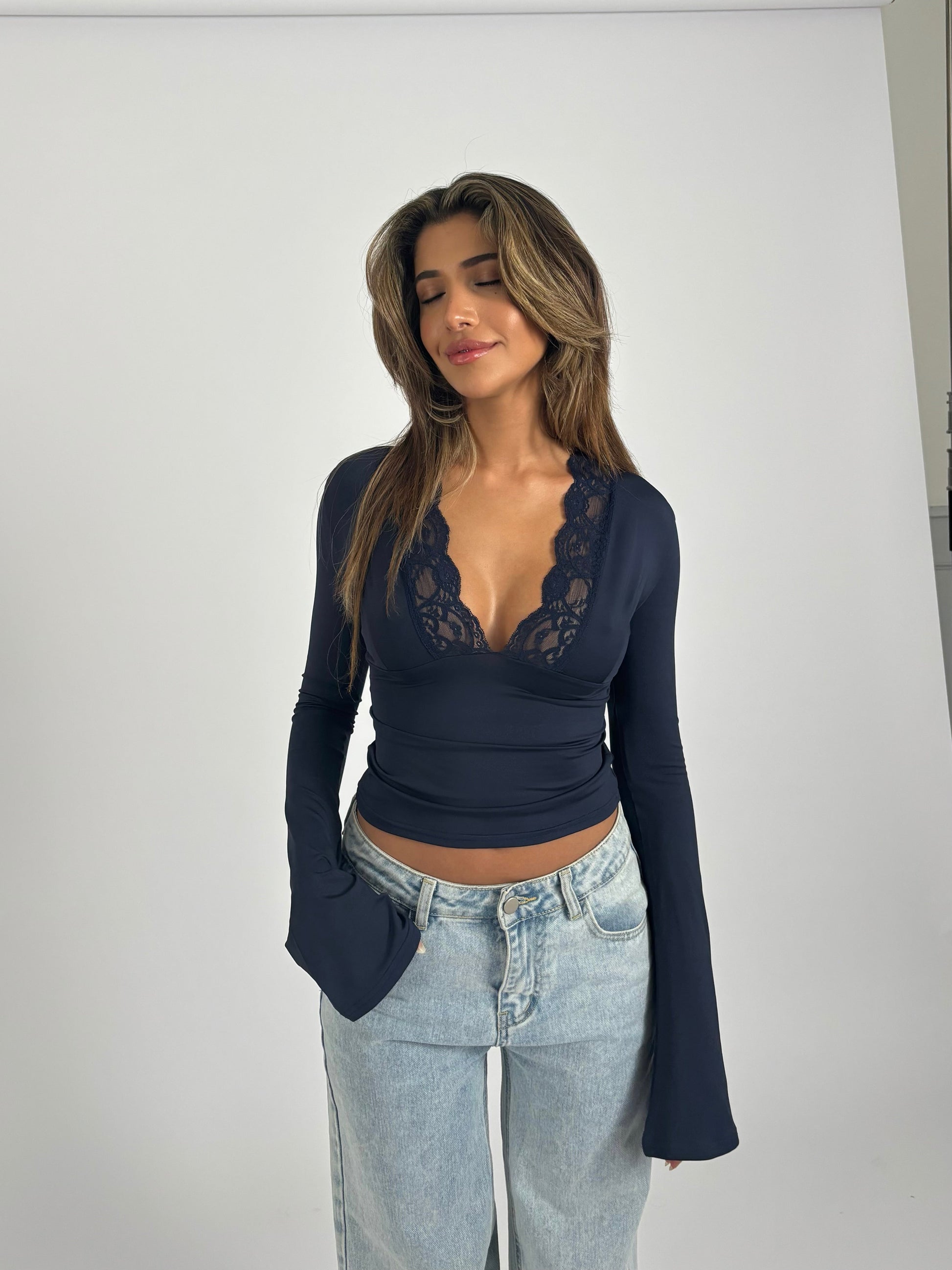 A gorgeous Maya Top crafted from a stretchy material that hugs your body beautifully, featuring delicate lace trim, long sleeves, and a flattering deep neckline.