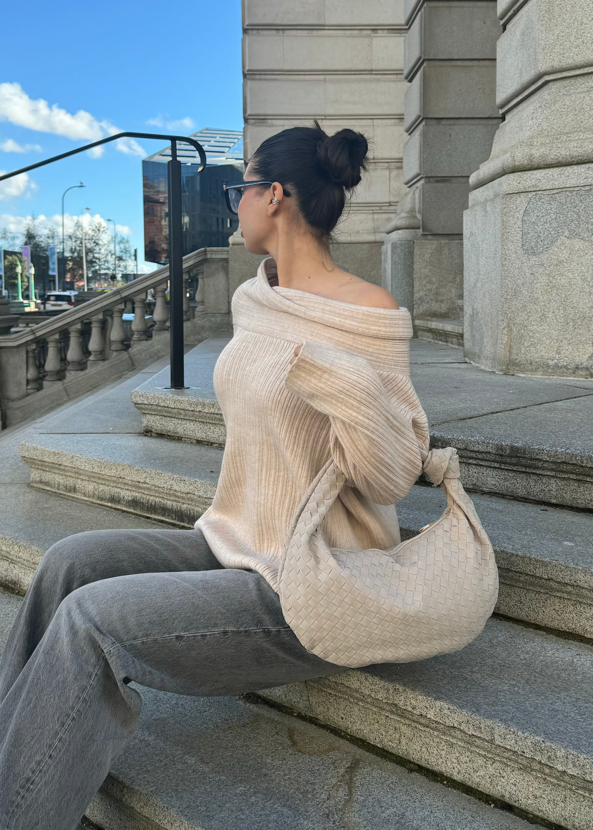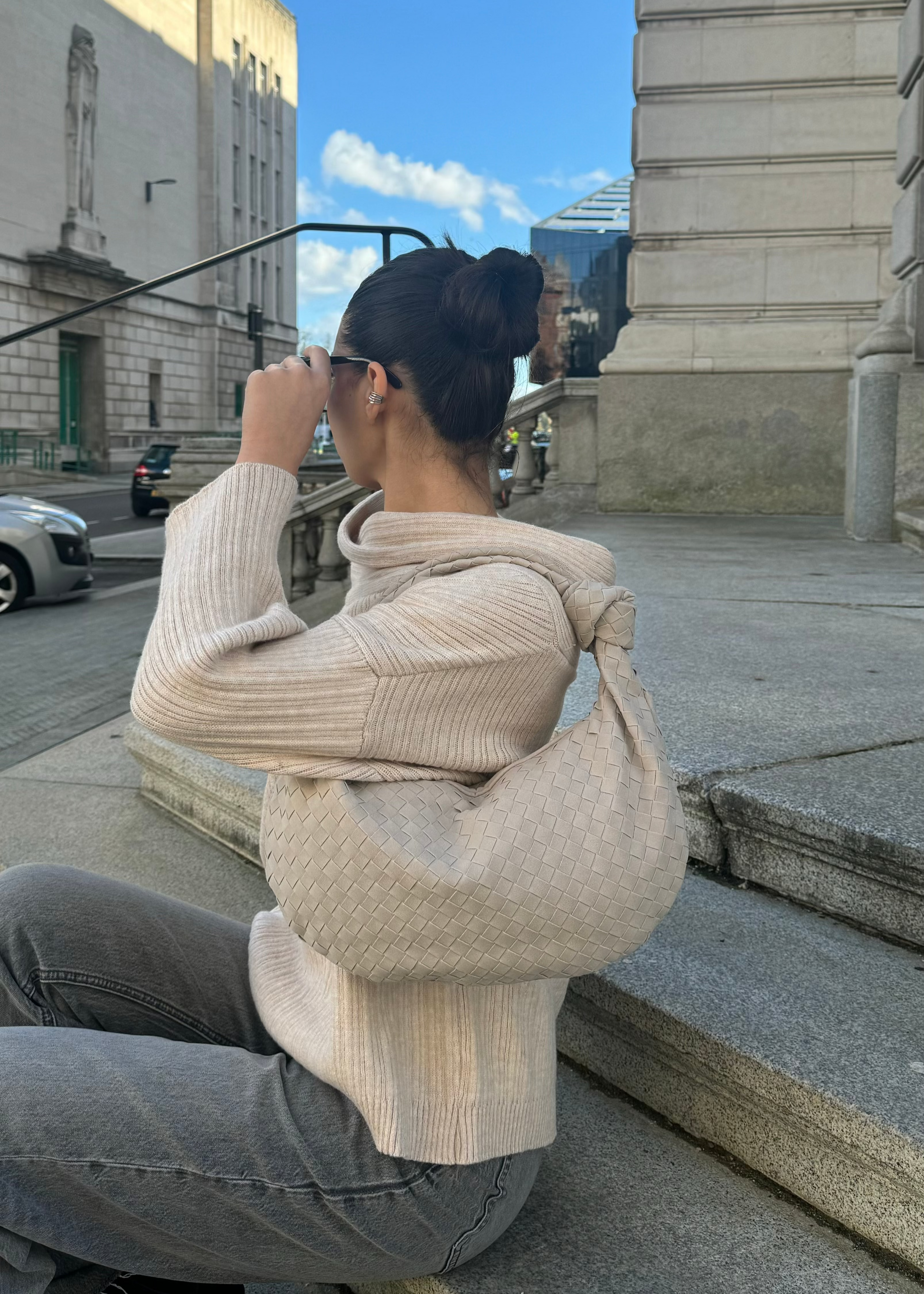 Our Silva Suede shoulder bag has a round shape and a woven/braided design with knot detail. The bag has a large main compartment with zip closure and a smaller compartment with zip inside the bag. Perfect for a city trip or everyday life.